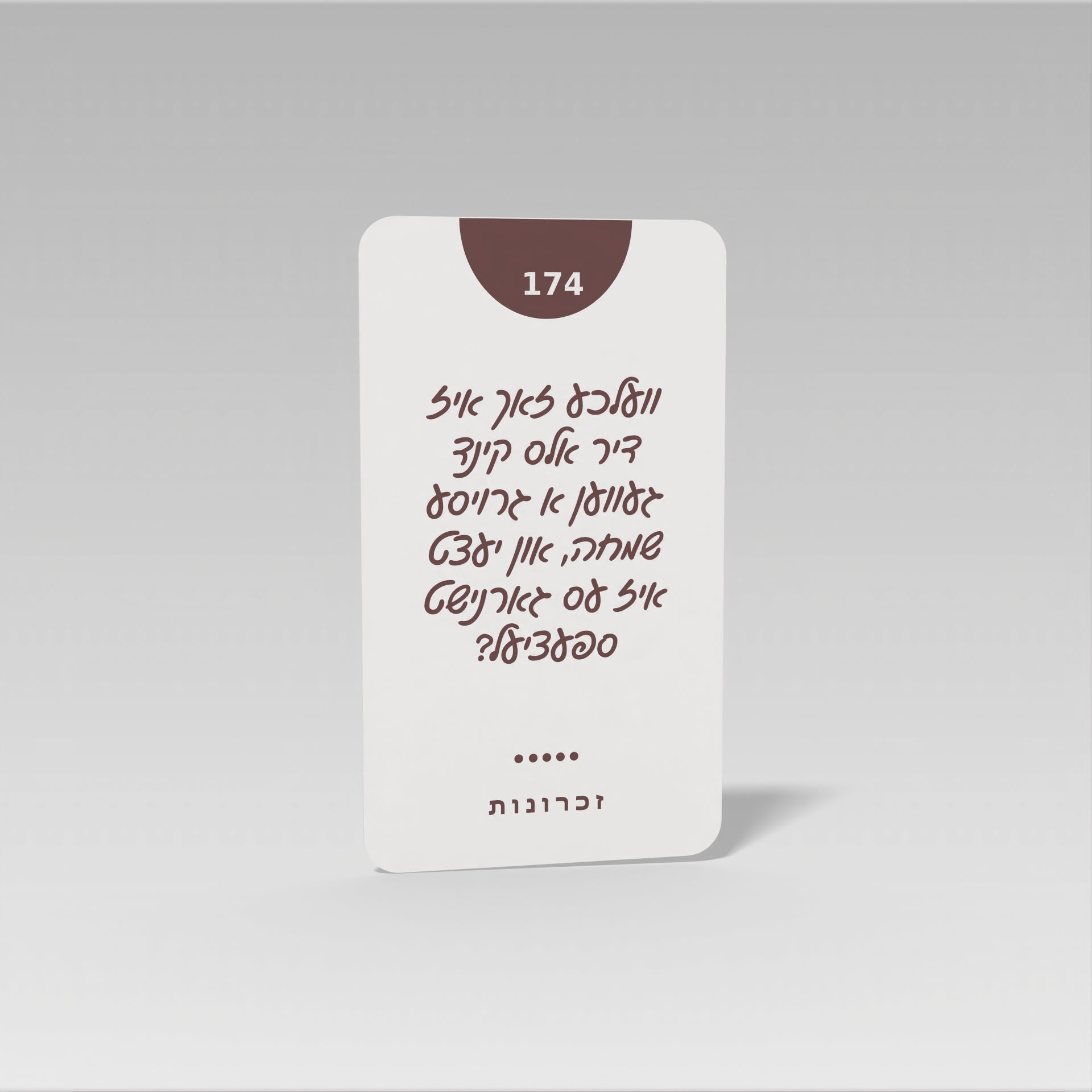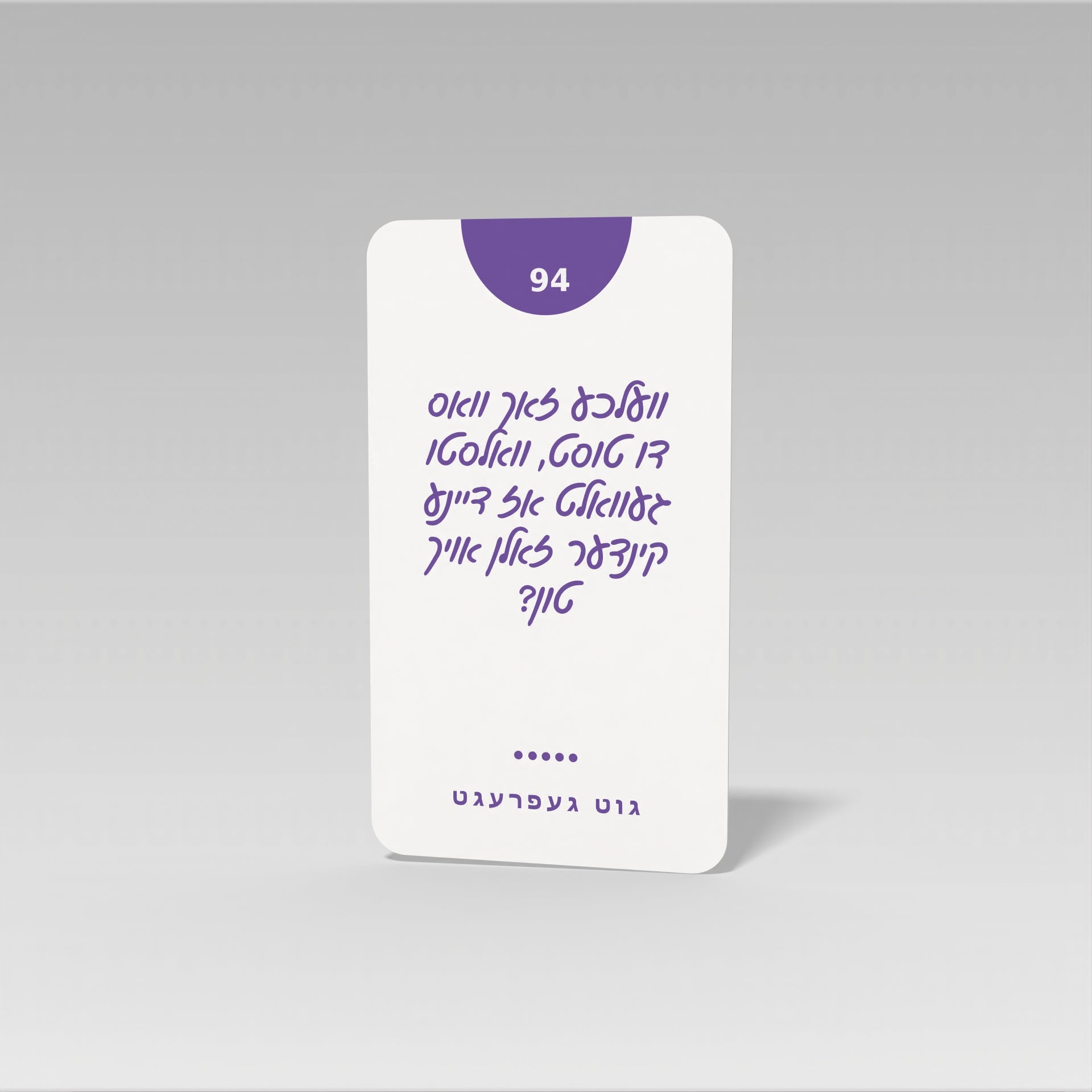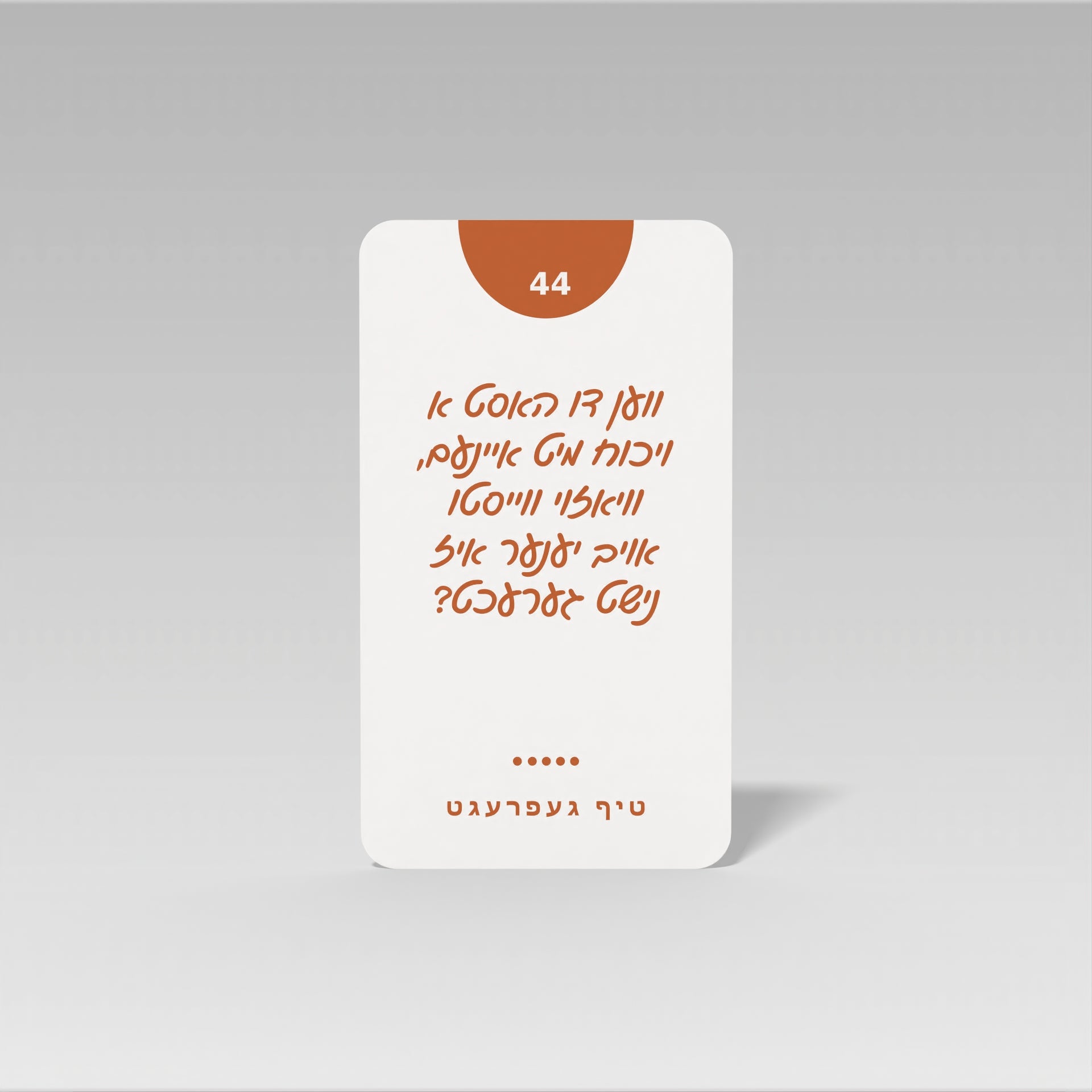 These Yiddish Conversational Cards were created by therapists with one goal in mind — to help people connect, think deeper, and have meaningful conversations in a fun and relaxed way. Each question was designed with a purpose, making every card a tool for growth and connection.